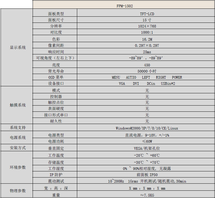 FPM-1502寬溫寬壓工業機架式顯示器 產品參數: