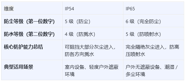 下面從防塵等級、防水等級核心維度,對比 IP54 與 IP65 的差異: