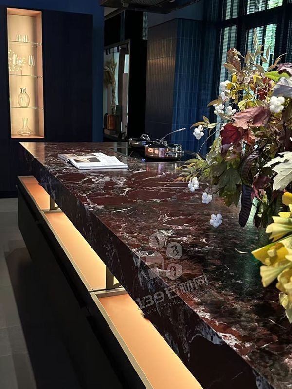 一、天然材質的 “藝術孤品” 屬性 紫羅紅大理石的 深紅底色 + 白色脈絡 是天然形成的 “潑墨畫”: 紋理 獨一無二(每塊石材的白紋走向、疏密都不同),自帶 “高定孤品” 的稀缺感; 表面 高光質感 如鏡面,折射光線時,白紋會隨角度變化呈現 “流動感”,仿佛將地質運動的韻律凝固在臺面。 二、色彩與氛圍的 “沖突平衡術” 紅與黑 / 藍的底色呼應: 大理石深紅底色,與背景深色柜體(深藍、黑色)形成 同色系層次對比(深紅更鮮艷,柜體更暗沉),既統一調性,又避免單調。 白紋與花藝的細節呼應: 石材中的白色脈絡,與花藝里的 白色漿果、淺色葉片 形成視覺串聯,讓 “硬” 的石材和 “柔” 的植物產生對話,中和了大理石的厚重感。 三、燈光設計的 “點睛魔法” 島臺下方的 嵌入式暖光(琥珀色) 是關鍵: 懸浮感營造:從底部照亮石材邊緣,讓厚重的大理石臺面 “懸浮” 起來,削弱物理重量感; 紋理強化:暖光打亮石材底部,使白紋的立體感更突出,宛如給紋理 “加了高光”; 氛圍升溫:暖光中和了深紅的冷冽,讓空間多了份 溫潤的奢華感(區別于冷光的 “距離感”)。 四、功能與藝術的 “雙重敘事” 社交核心的 “視覺錨點”: 島臺是廚房 / 客廳的社交中心,紫羅紅大理石以 強烈的視覺沖擊 成為空間 “C 位”,擺放書籍、花藝后,從 “操作臺面” 升級為 藝術展示臺,承載交流、打卡、審美體驗等多重功能。 “剛柔并濟” 的氣質適配: 大理石的 硬朗質感(天然石材的剛性),與周圍玻璃柜(通透)、布藝窗簾(柔軟)、金屬器具(精致)搭配,形成 材質混搭的平衡美學,讓空間既有 “高端氣場”,又不失生活溫度。 這種設計將紫羅紅大理石的 天然藝術感 與 空間需求 深度融合:既利用它的 “吸睛力” 打造焦點,又通過色彩、燈光、搭配弱化其 “厚重感”,最終實現 “奢華不壓抑,實用又藝術” 的高階美學表達。
