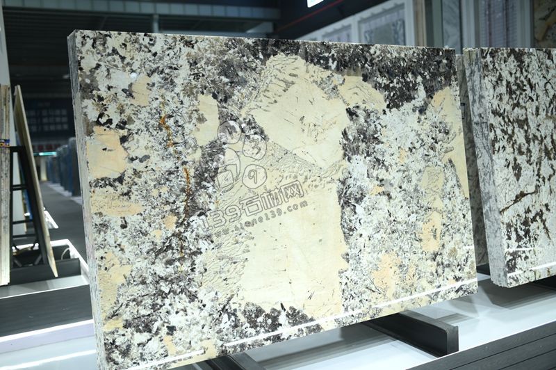 色彩層次:板面融合灰、白、金、黑四色,天然形成 “白花底、墨汁斑、黃金紋” 的視覺組合,部分板面含藍(lán)色或綠色水晶晶體,形成 “金砂漫天” 的奇幻效果。